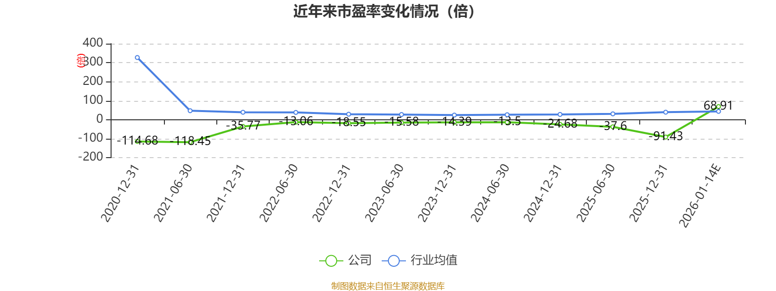 中证智能财讯蓝科高新(601798)1月14日晚间披露2025年度业绩预告,公司预计营业收入较上年同期增加约46.55%;预计2025年归母净利润4779.65万元,上年同期亏损8840.06万元;扣非净利润预计3069.21万元,上年同期亏损1.01亿元。以1月14日收盘价计算,蓝科高新目前市盈率(TTM)约为68.91倍,市净率(LF)约2.6倍,市销率(TTM)约4.3倍。