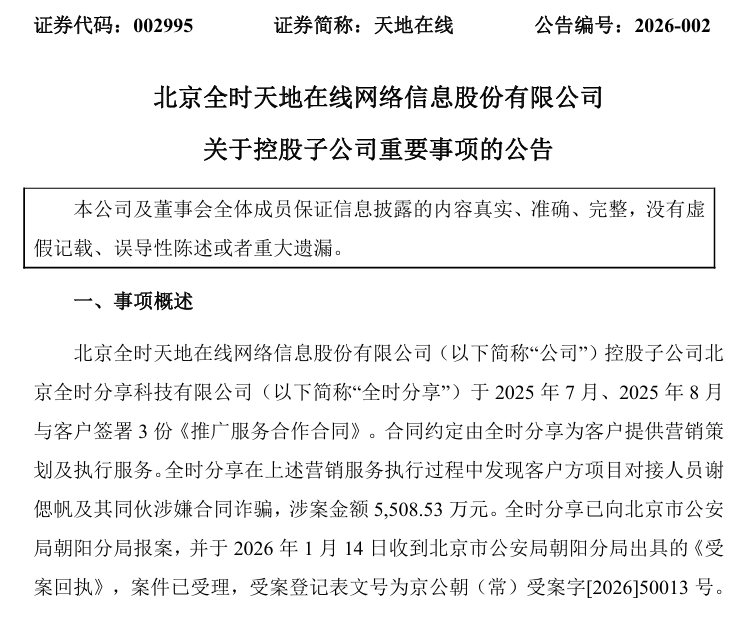1月14日,天地在线(002995)发布公告,公司的控股子公司北京全时分享科技有限公司与客户签署3份推广服务合作合同。全时分享在营销服务执行过程中发现客户方项目对接人员谢偲帆及其同伙涉嫌合同诈骗,涉案金额5509万元。