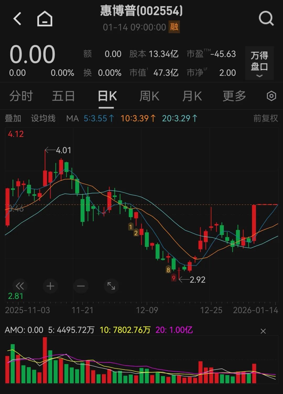 从资本市场表现看,在本次停牌前最后一个交易日(1月8日),惠博普股价高开高走,午后封于涨停直至收盘,当日收盘价为3.55元/股。