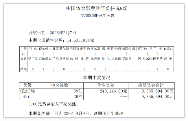 北京时间2月7日,胜负彩第26027期开奖结果揭晓。本期任九开出39注,奖金24万多元,是2026年至今任九开出的最高奖金。本期任九投注总额为14,633,934元。