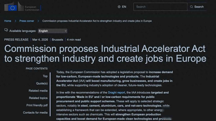 2026年3月,欧盟眨眼间推出《工业加快器法案》,名义说这是为了保险产业安全,推行上只针对四个鸿沟,便是电动汽车、能源电板、光伏和短处原材料,法案里写得皎皎嫩白,只须一个国度在这四个鸿沟的全球产能逾越40%,它对欧盟企业的投资就要接收四条放肆,全宇宙算下来,独一中国相宜这个条目,好意思国、日本、韩国的企业齐全不受影响,法律条规摆在那里,气忿便是明摆着的。