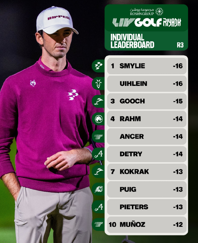 作为2026赛季重大赛制调整的一部分,联赛首场72洞常规赛季赛事将于周六晚间在利雅得高尔夫俱乐部进行第四轮之后落幕。撕裂队新成员埃尔维斯·斯迈利(Elvis Smylie)与山羊队联赛创始成员皮特·尤莱(Peter Uihlein)以200杆,低于标准杆16杆的成绩并列领先。扣杀队新任队长泰勒·古奇仅仅落后1杆,排名第三位,是两位并列领先者身后6杆范围内17名追赶者中最接近的一个。
