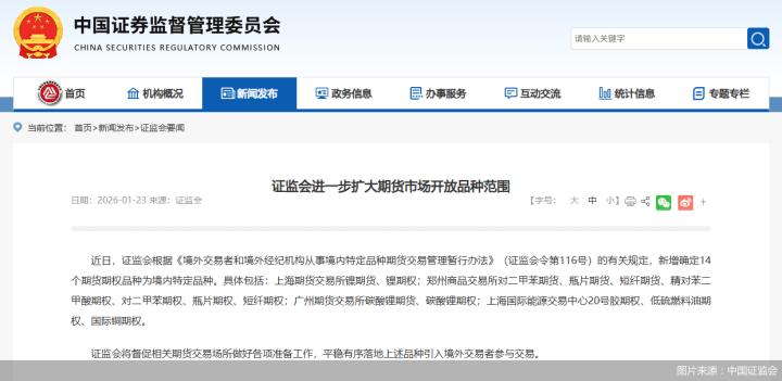 北京商报讯(记者刘宇阳)1月23日,中国证监会发文表示,近日,中国证监会根据《境外交易者和境外经纪机构从事境内特定品种期货交易管理暂行办法》的有关规定,庄闲和游戏新增确定14个期货期权品种为境内特定品种。具体包括:上海期货交易所镍期货、镍期权;郑州商品交易所对二甲苯期货、瓶片期货、短纤期货、精对苯二甲酸期权、对二甲苯期权、瓶片期权、短纤期权;广州期货交易所碳酸锂期货、碳酸锂期权;上海国际能源交易中心20号胶期权、低硫燃料油期权、国际铜期权。